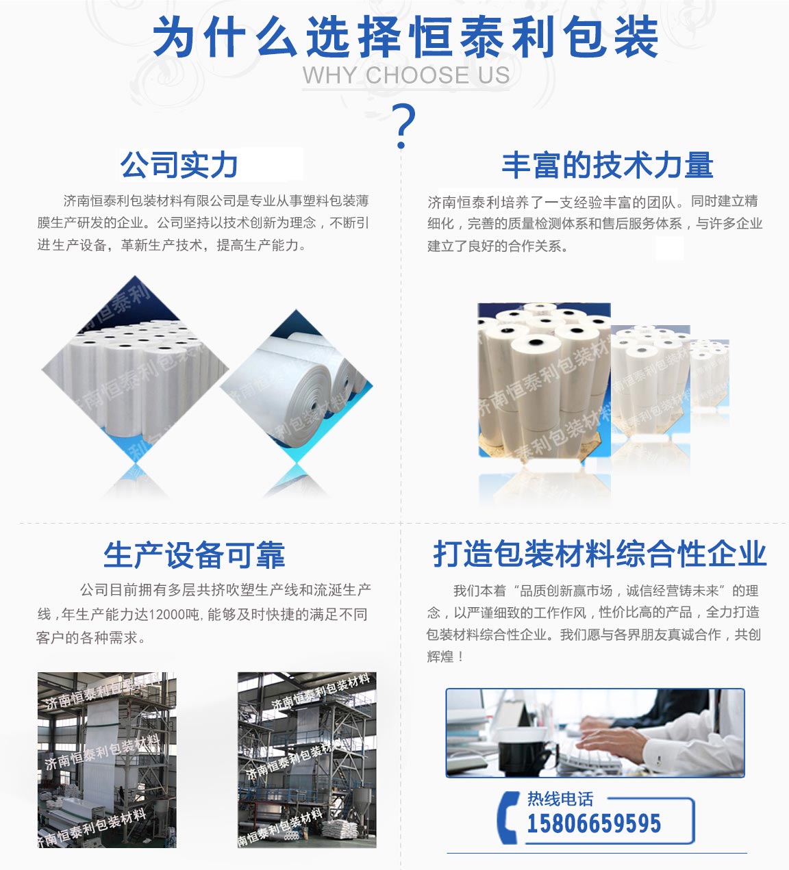 濟南恒泰利包裝材料有限公司位于濟南市市中區(qū),是從事塑料包裝薄膜生產研發(fā)的企業(yè)。公司成立十幾年以來,堅持以技術創(chuàng)新為理念,不斷引進生產設備,革新生產技術,提高生產能力。并堅持自主創(chuàng)新,加強企業(yè)管理,培養(yǎng)了一支經驗豐富的團隊。同時企業(yè)建立高標準、精細化質量檢測管理體系和完善的售后服務體系,與國內外許多家企業(yè)建立了良好密切的合作關系。公司目前擁有多層共擠吹塑生產線和流延生產線,年生產能力達12000噸,能夠及時快捷的滿...